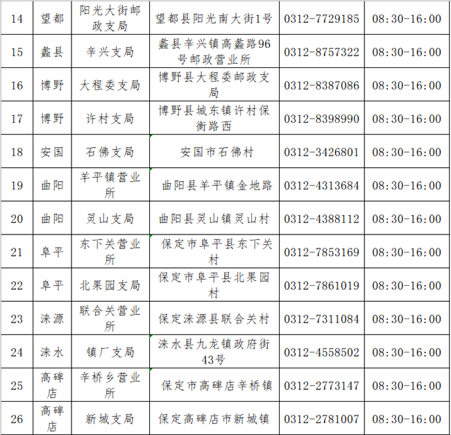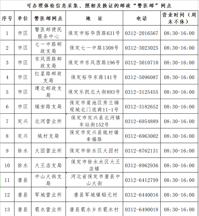 办理期满换证业务的邮政网点联系方式。 保定交警提供