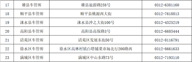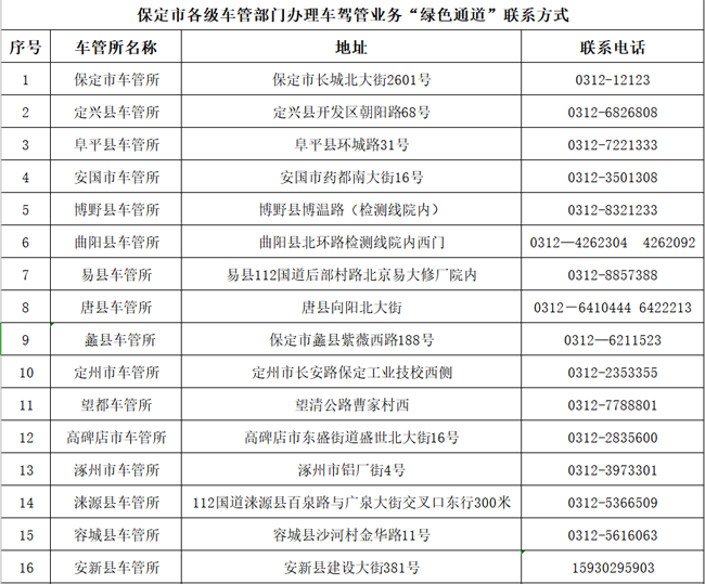 各级车管部门“绿色通道”联系方式。 保定交警提供