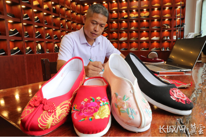 “宫廷布鞋制作技艺”传承人刘五代在创作中。 通讯员 赵端 摄