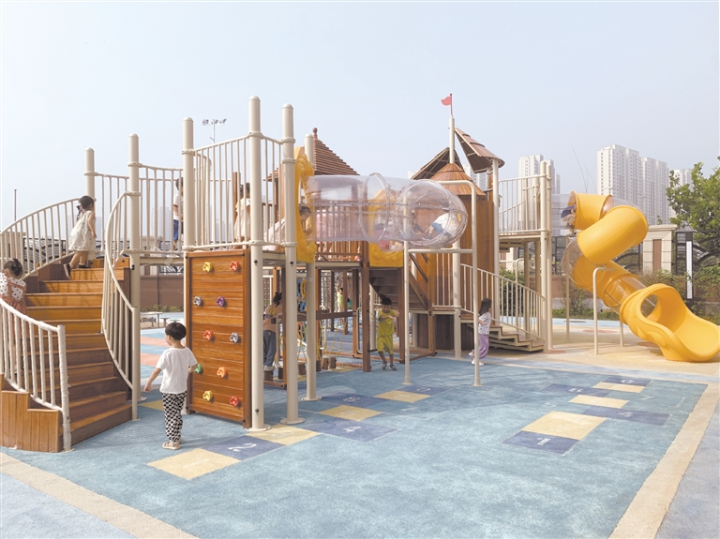 雷小敬告诉记者,幼儿园原为曹庄旭日幼儿园,设在曹庄村内,由于村内路面易积水,交通不便,园内多为本村孩子,教师流动性大。2021年2月,幼儿园在主城区城市更新一期项目中被拆除,园内孩子和老师整体搬迁至高新区幼儿园就学办公。今年5月,新园竣工交付,旭日幼儿园搬回新址重新办园。新建幼儿园建筑美观,宽敞明亮、功能齐全,户外活动场地扩建至1400平方米,全部铺设橡胶地面,设有沙水区、体育活动区、户外游戏区、种植绿化区等多个区域供孩子们户外活动;室内设有多功能厅、绘本馆、音舞活动室等多类学习场所,并配有中央空调、新风系统、消防系统,为幼儿在园学习、生活提供舒适环境。