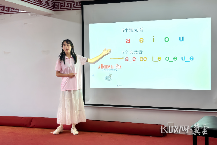 7月18日,志愿者为孩子们讲解英语课程。通讯员 佟一欣 摄