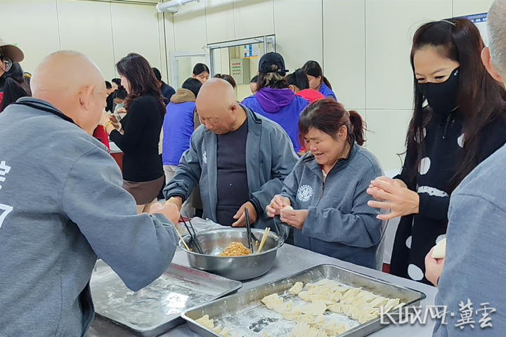 志愿者与老人们正在包饺子。通讯员 尹默 摄