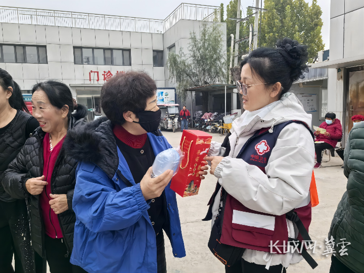 工作人员向居民发放健康礼品。通讯员 白露 摄