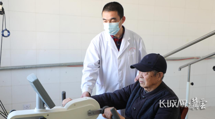 在保定市涞水县赵各庄中心卫生院康复训练室,医生正在指导老人进行器械康复训练。通讯员 徐梓钰 摄