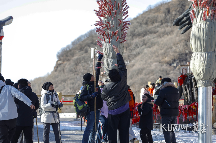 此外,景区6米高的糖葫芦树成游客打卡点。活动现场,几棵“巨型糖葫芦树”惊艳亮相,串串鲜亮糖葫芦垂挂枝头,年味十足。游客们创意百出,或合作托举,或巧妙借用工具,欢声笑语中摘取“新年第一串甜蜜”。这场趣味十足的互动,让传统小吃变身节日风景,成为寒冷冬日里最温暖甜美的记忆。“没想到能在这么高的山上看到这么有创意的巨型糖葫芦,孩子们都很兴奋,这种记忆独特令人难忘。”游客张女士开心地说。