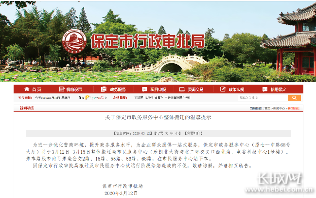 长城网保定讯(记者 王日成)3月12日,保定市行政审批局发布公告称,即日起至3月15日,保定市政务服务中心将整体搬迁至市民服务中心。搬迁完成后,可为广大市民提供一站式服务。