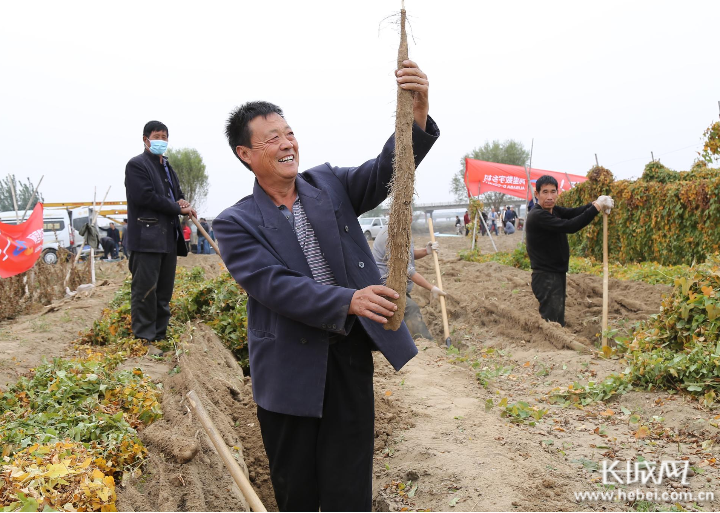 与此同时,蠡县2020中国农民丰收节分会场也在该县潴龙河畔的滑岗村拉开帷幕。上千亩的麻山药种植区内,村民们正在抓紧收获麻山药,田地一旁就是各大采购商的货车,新出土的麻山药不一会儿就被装车发往京津冀等地。