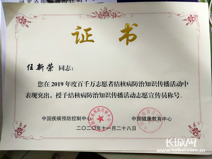 几年来,任新荣开展了100多次防治结核病宣传活动,最终连续荣获两届“百万志愿者结核病防治知识传播优秀个人”称号。
