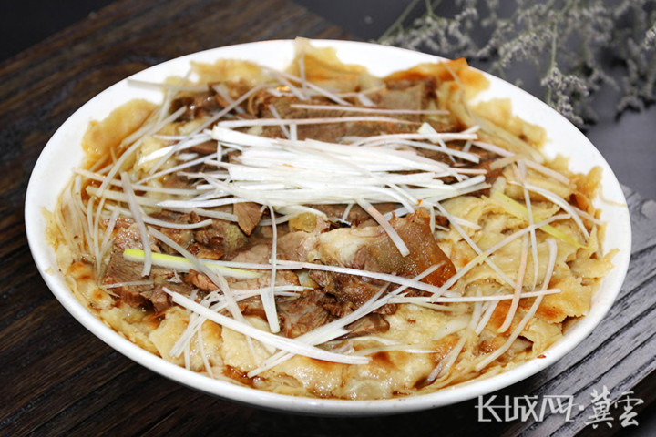 “白家罩饼”原名“老白牛肉罩饼”,由白络春老人创办于1923年,如今是省级非物质文化遗产。罩饼汤色红润,做工精细、火候恰当、肥而不腻、清香扑鼻。白家罩饼的牛肉色泽红润,肉质肥嫩;饼为荷叶饼,层多,撕成寸大的云彩形状,经百年老汤一勺一勺加热罩透,牛肉和饼松软适口,撒上香葱,再配一小盘白家独特配方烹制的辣椒,吃起来香气扑鼻,味道鲜美。