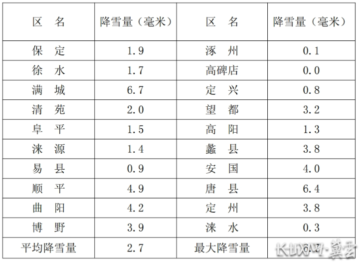 长城网·冀云客户端2月20日讯(记者 马书广)今天15时,保定市气象局发布降雪实况:2月19日20时到2月20日15时保定市出现降雪天气,全市平均降雪量2.7毫米,主城区降雪量1.9毫米。全市最大降雪满城6.7毫米,最大积雪深度9厘米。