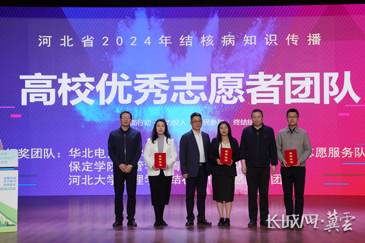 活动现场,河北省疾控局向保定市疾控中心颁发2024年河北省百千万志愿者结核病防治知识传播活动优秀组织奖,华北电力大学“终‘结’行动 共享健康”志愿服务队、保定学院经管学院“青春圆梦”志愿者团队、河北大学护理学院结核病防治志愿服务队被授予河北省2024年结核病知识传播高校优秀志愿者团队。