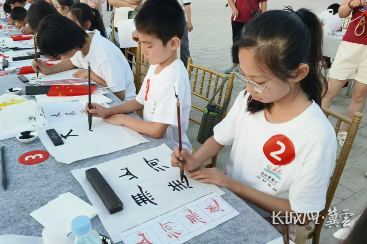 8月24日晚,保定市徐水区“笔墨山河 铭记峥嵘”百人共书百米长卷主题书画活动在该区刘伶公园举行。