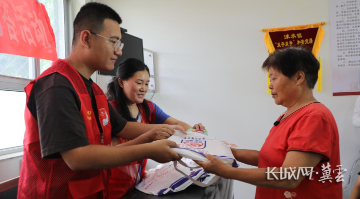 在保定涞水县涞水镇南王庄村,普法志愿者正在向村民发放普法宣传品。通讯员 徐梓钰 摄