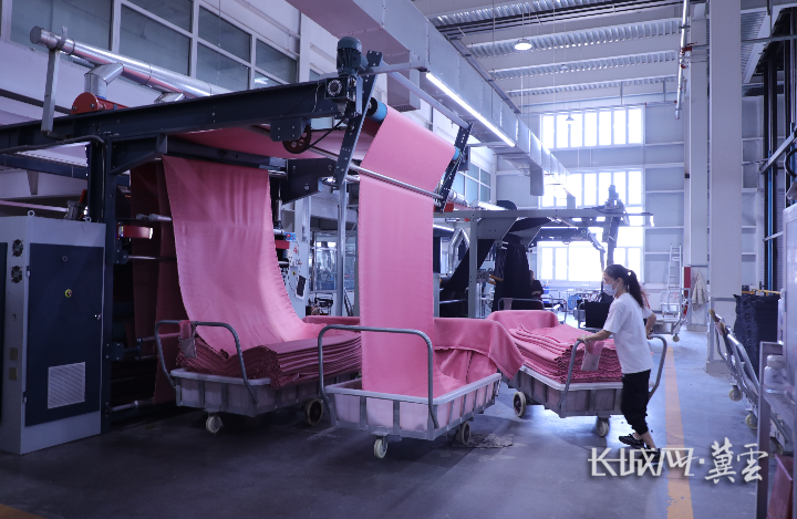 长城网·冀云客户端讯(通讯员 李萌萌 赵思琪)染色、洗呢、缩呢、烘干定型、起毛、轧软……10月16日,在保定市蠡县经济开发区河北冰海蓝衣纺织服饰制造有限公司的生产车间内,全自动染整设备精准调控参数,智能化传送系统有序输送物料。