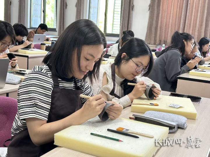 研学学子体验定窑刻花技艺。曲阳县委宣传部 供图