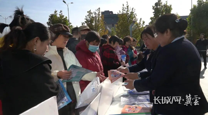 活动现场,工作人员在分发宣传页并讲解反诈知识。 阜平县融媒体中心 供图