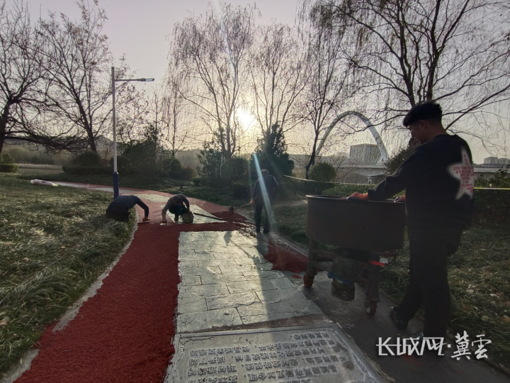 工作人员维修塑胶步道。阜平县城市管理综合行政执法局 供图