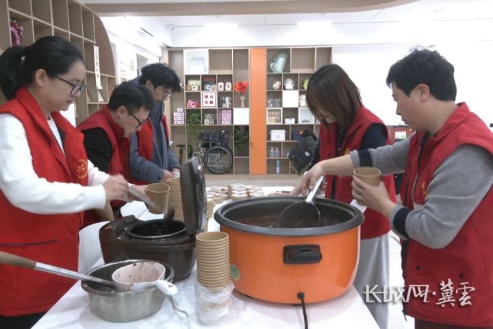 社区工作人员、党员志愿者和热心居民将提前熬制好的腊八粥分装打包。通讯员 王明 摄