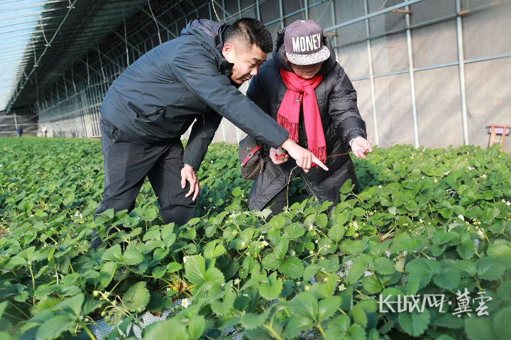 农技人员查看大棚草莓开花情况和长势。通讯员 赵端 摄