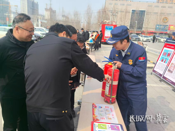 消防宣传人员现场讲解如何辨别真假灭火器。通讯员 文业 摄
