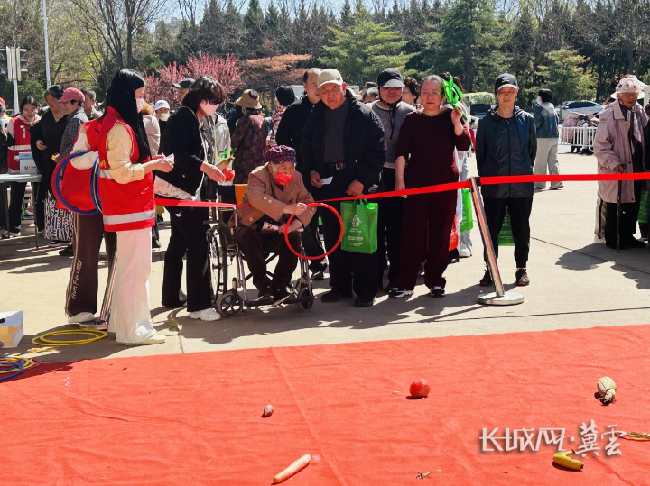 在趣味运动会现场,“趣味套瓜果”“幸运投沙包”“蒙眼识蔬果”“好运滚滚来”“纸杯快跑”等项目吸引了许多老年人参与。他们默契配合、闯关打卡,欢声笑语不断。