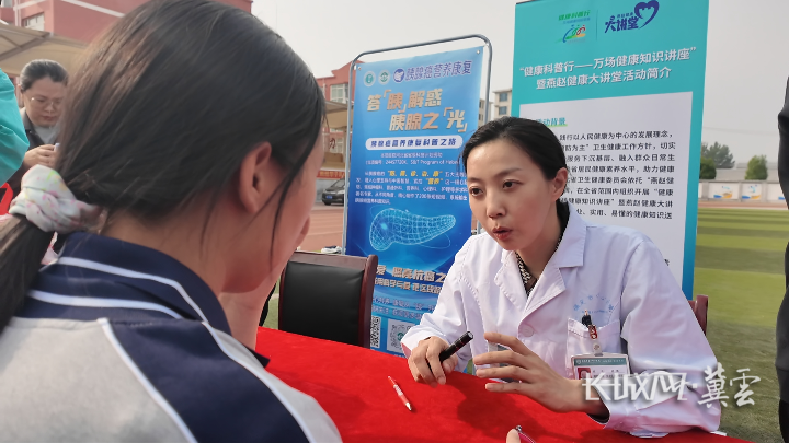 义诊环节,来自保定市第一中心医院、高阳县医院、县妇幼保健院、县中医医院的专家为师生开展健康服务;县疾病预防控制中心发放科普资料和宣传品;县中医医院还设置了刮痧、耳穴压豆等中医适宜技术体验环节,展示代茶饮、养生香囊等文创产品并开展捣药、香囊制作等互动活动。